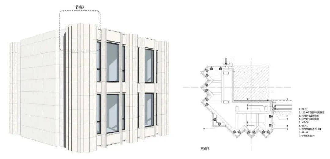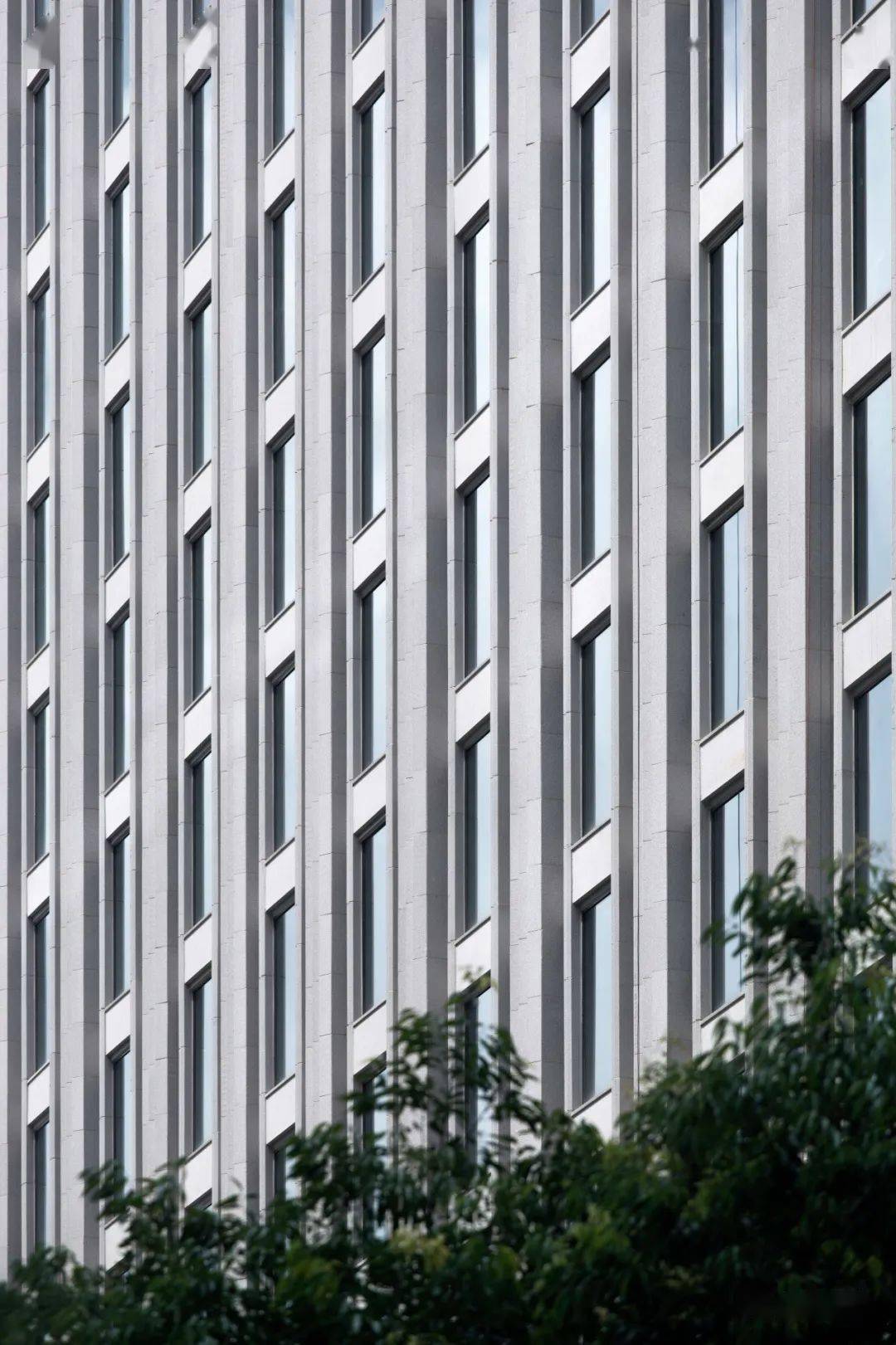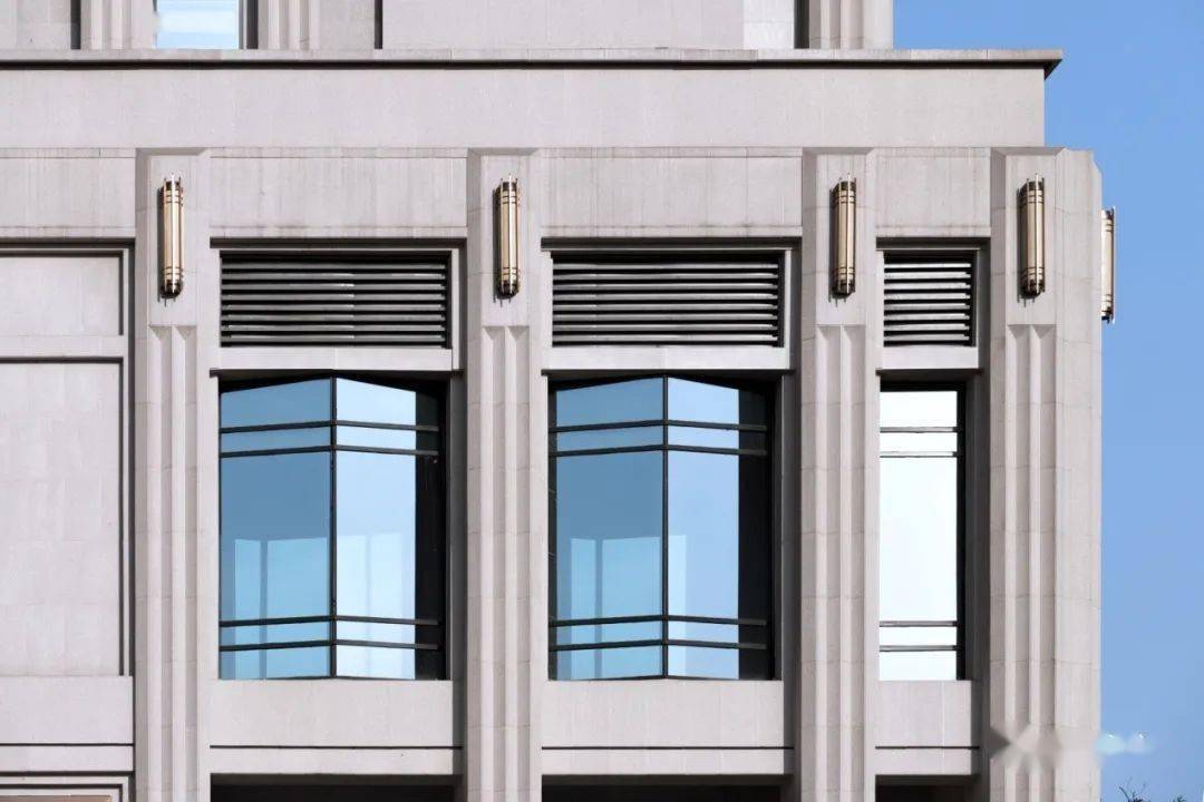 纖細(xì)的兩棱石材窗框與三棱的細(xì)柱形成統(tǒng)一且有變化的韻律