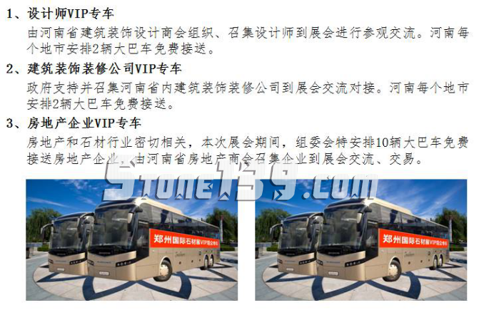 應(yīng)政府要求,組委會(huì)決定于9月3-5日展會(huì)期間,派遣大巴車到鄭州市、開(kāi)封市、平頂山市、洛陽(yáng)市、商丘市、安陽(yáng)市、新鄉(xiāng)市、許昌市、鶴壁市、焦作市、濮陽(yáng)市、漯河市、三門峽市、周口市、駐馬店市、南陽(yáng)市、信陽(yáng)市、濟(jì)源市等河南18個(gè)地市,免費(fèi)迎接設(shè)計(jì)師、房地產(chǎn)企業(yè)、建筑裝飾裝修公司、風(fēng)景園林機(jī)構(gòu)等石材直接使用方到展會(huì)與石材企業(yè)一對(duì)一交流對(duì)接。
