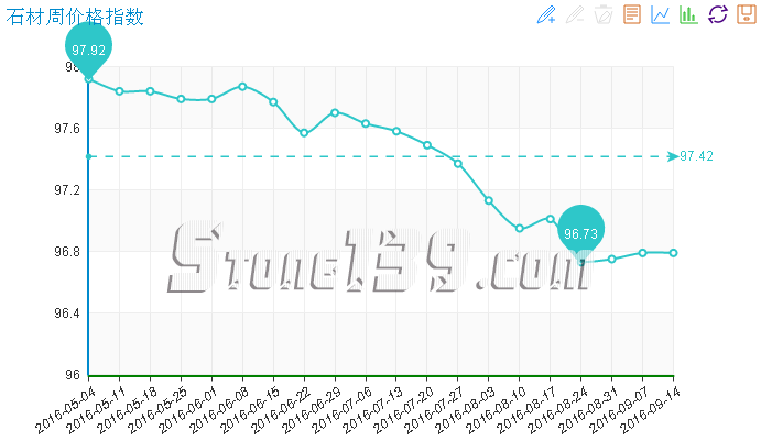 據(jù)“中國(guó)·水頭石材指數(shù)”系統(tǒng)監(jiān)測(cè),20160914期石材周價(jià)格指數(shù)收?qǐng)?bào)于96.79點(diǎn),與上周基本持平。本周石材價(jià)格走勢(shì)平穩(wěn),其中花崗石、其他石材類(lèi)價(jià)格環(huán)比繼續(xù)持平,大理石價(jià)格略微回調(diào),合成大理石類(lèi)價(jià)格止跌微升。本周除部分大板價(jià)格隨市場(chǎng)行情波動(dòng)正常調(diào)整外,大部分石材價(jià)格總體較穩(wěn)定。
